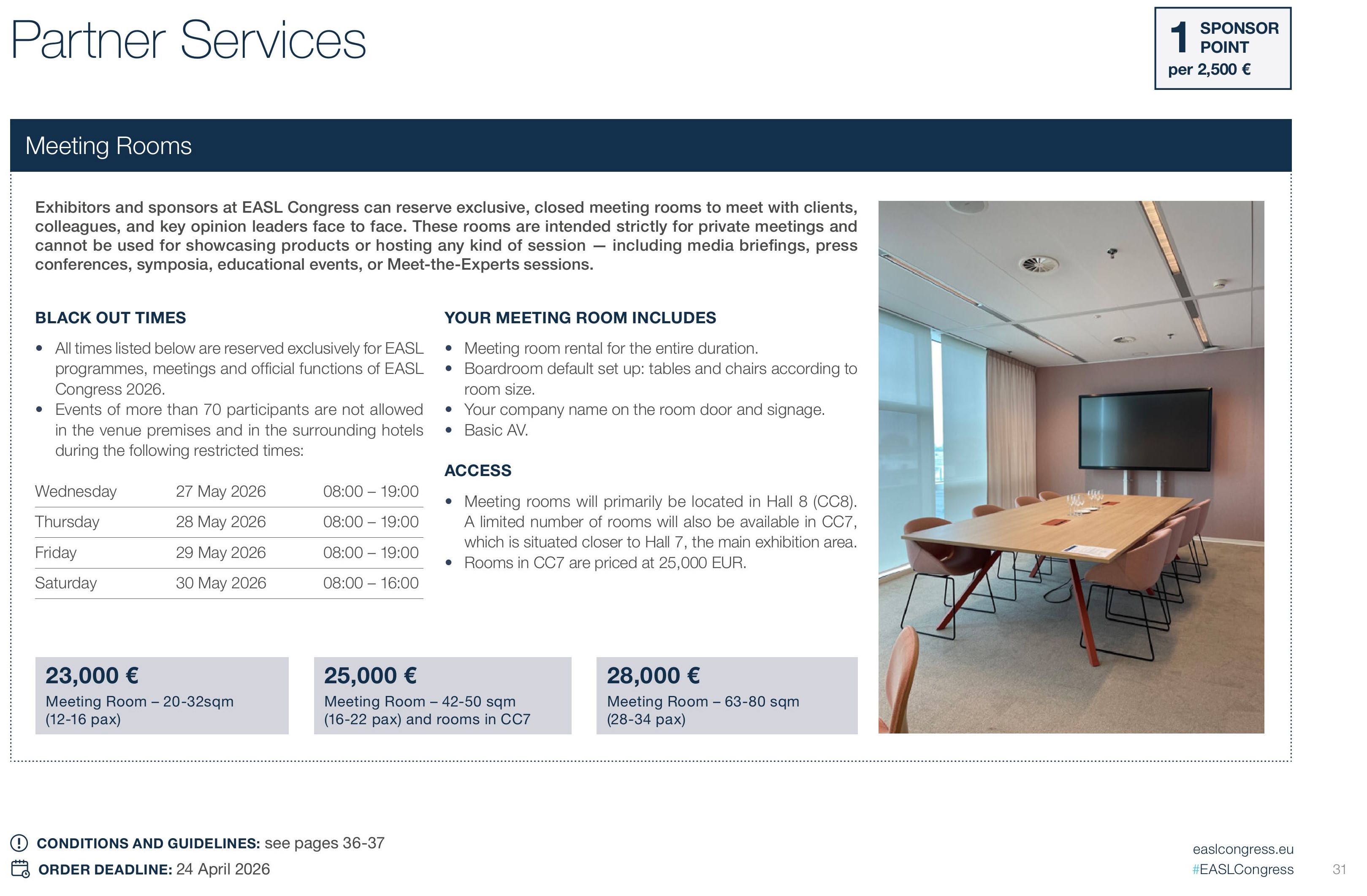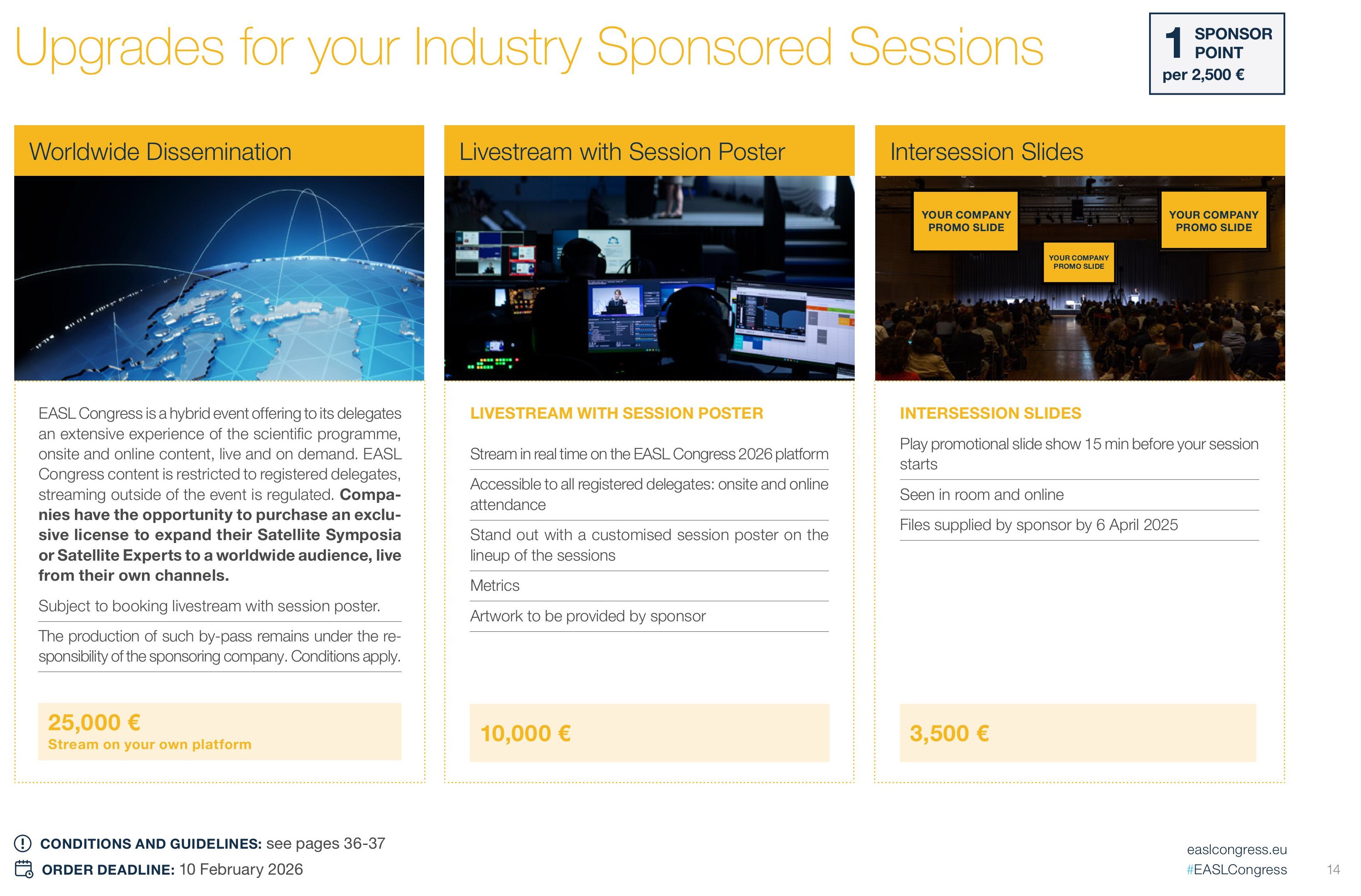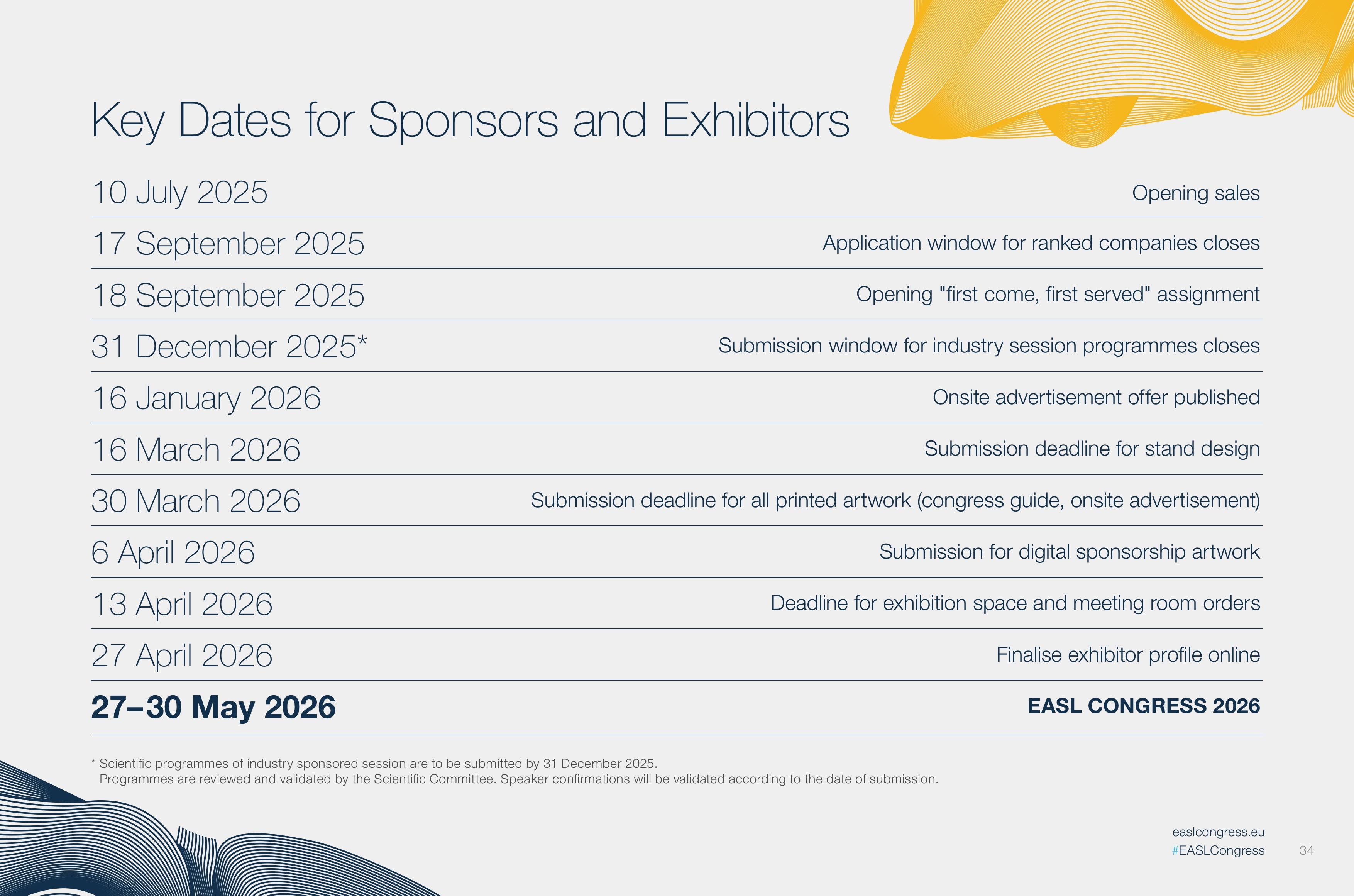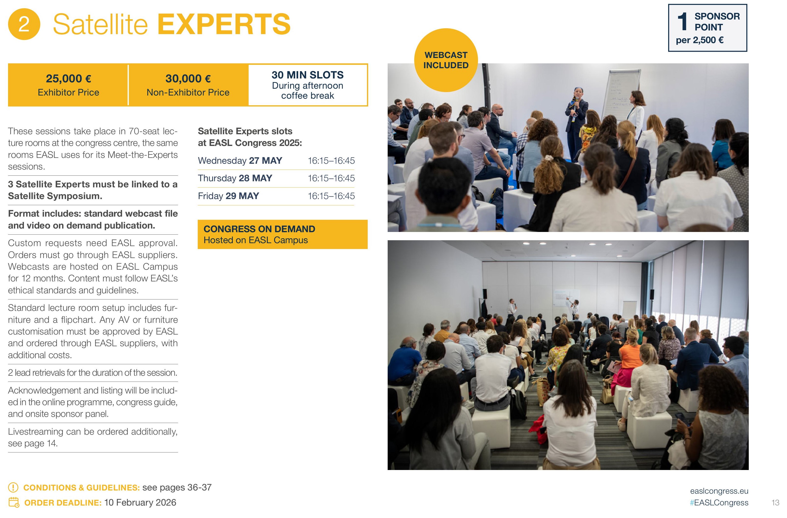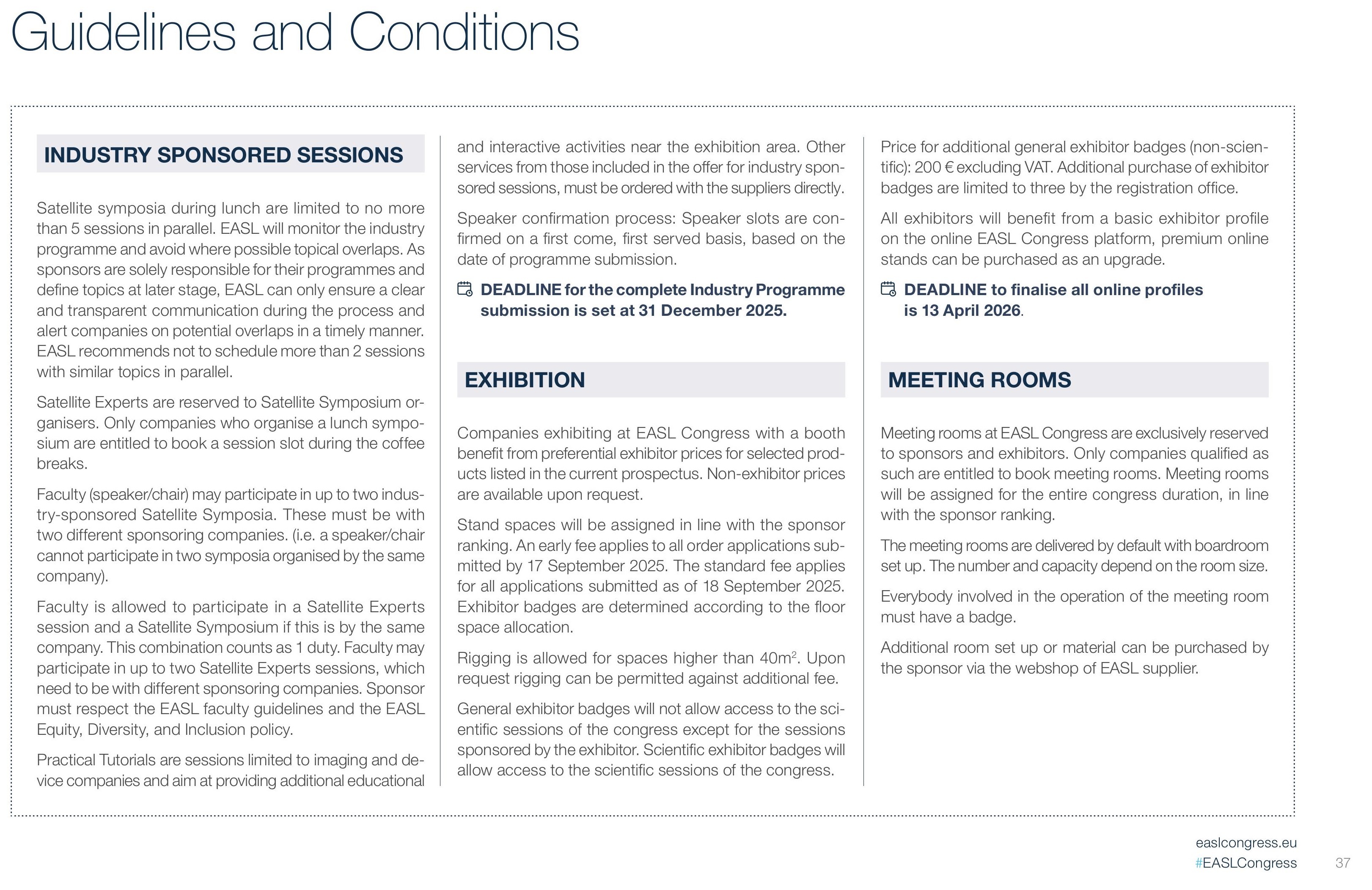 {"header":"Meet-the-Experts, Workshops & Skills Learning Centre ","content":"To enhance interactivity, these sessions have a limited number of available seats. To enhance interactivity, seating is limited. Participation is on a first-come, first-served basis, with priority access for EASL Member delegates. Please ensure you are present at the session door at least 15 minutes before the session starts. Meet-the-expert sessions will be live-streamed and can also be accessed on-demand. Overflow arrangements will be made at the Track Hubs situated in Hall 7. Skills learning centres & Workshops will only be available in person.","expanded":false},